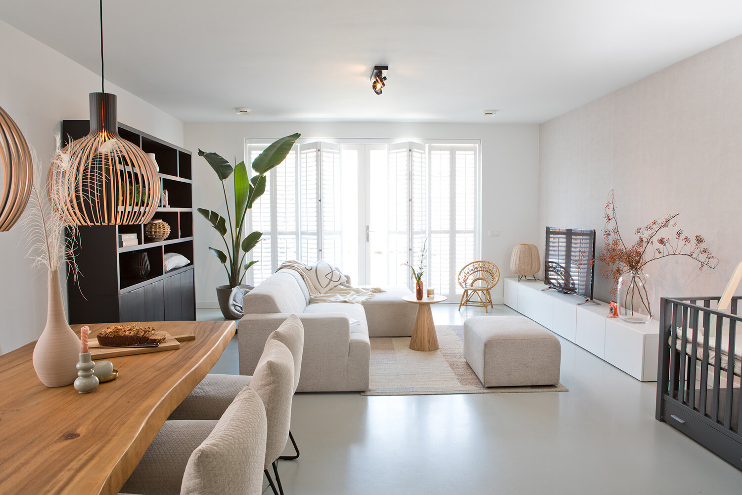 In de zithoek zorgt het donkere wandmeubel eveneens voor contrast, terwijl verder vooral lichte en natuurlijke kleuren het beeld bepalen. De gerieflijke bank met hocker nodigt uit tot lui achteroverleunen en televisie kijken. De prachtige rotanstoel kocht Emily nadat ze die bij een klant had gezien. Aan lichtinval geen gebrek, de witte shutters kunnen het daglicht zo nodig beperken of buitensluiten. De hele begane grond heeft een mooie strakke beige gietvloer; op de wanden is stucwerk en renovlies behang in rustige tinten aangebracht.