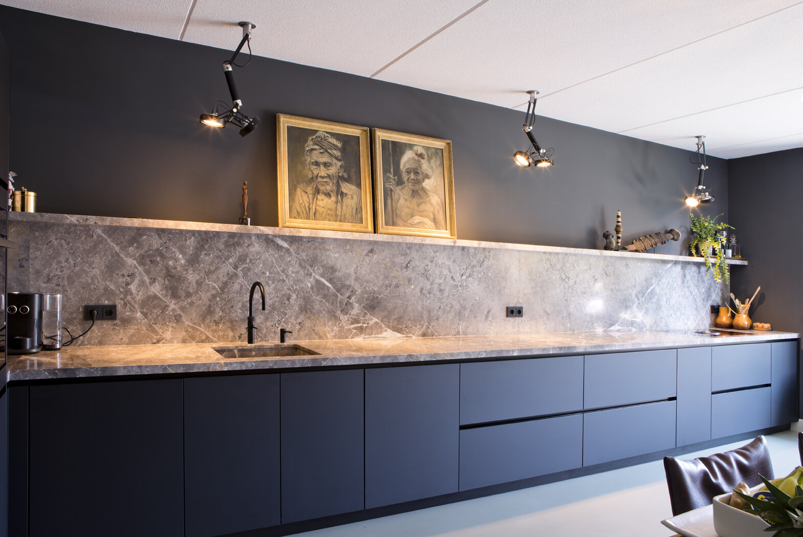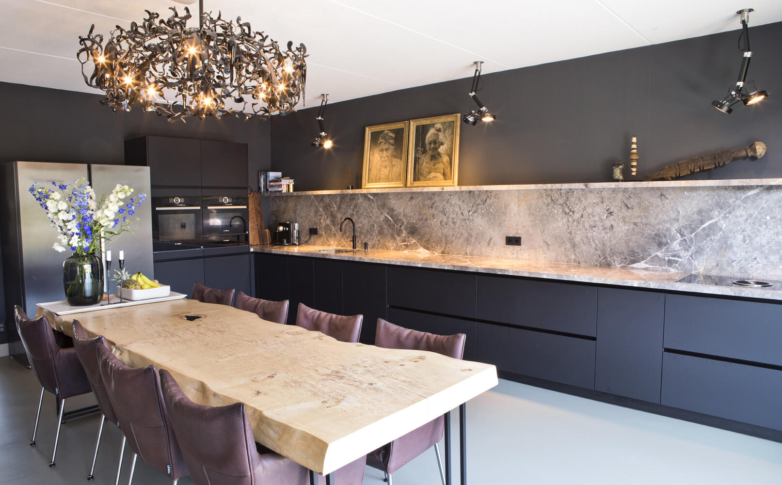 De matzwarte keuken is maar liefst 6,6 meter lang geworden met een werkblad en achterwand van Fiore di Bosco marmer en een Bora inductiekookplaat met geïntegreerde afzuiging. Voor de verlichting van het werkblad zijn industriële spots van Modular toegepast. Tegen de wand tussen keuken en zithoek is een groot wandmeubel met oven, magnetron en bergruimte geplaatst. Daarnaast staat een losse ijskast met dubbele deur.