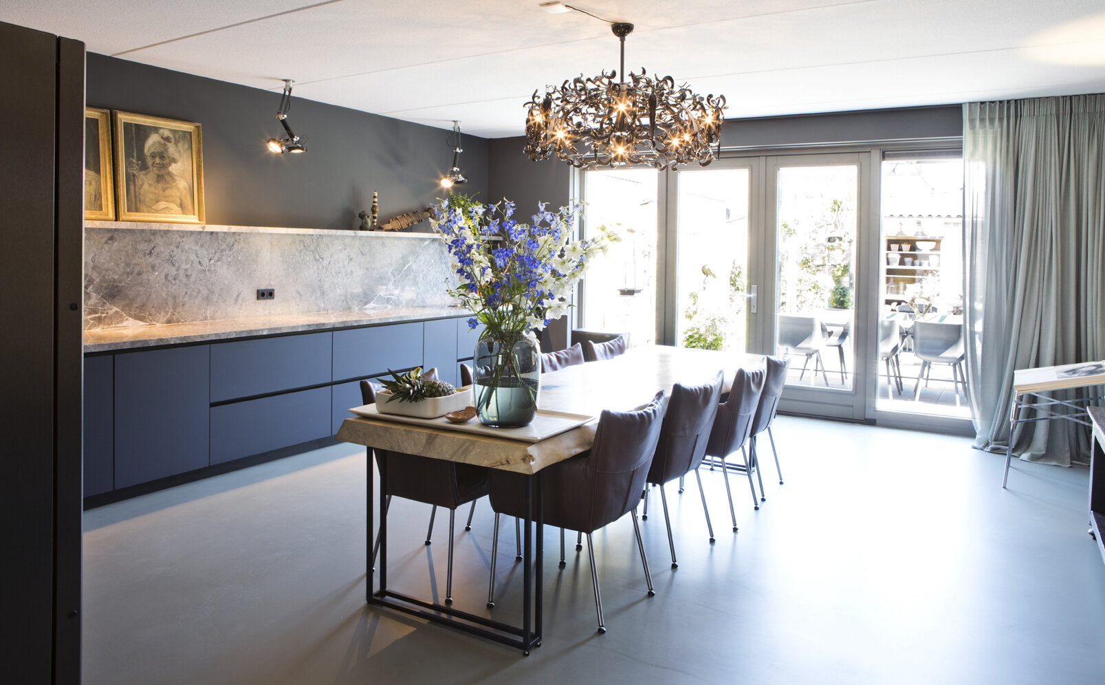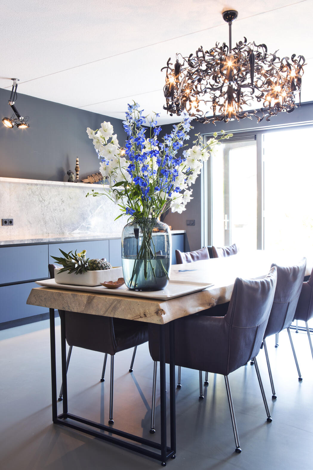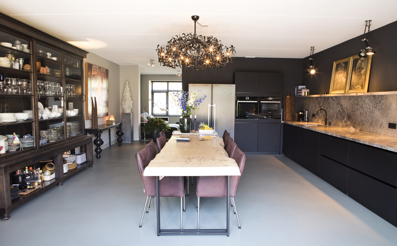 De eettafel in de keuken is uit één stuk gemaakt van een echte boomstam en met een onderstel van gemoffeld staal. Hier kunnen zeker acht gasten genieten van de maaltijd, goed verlicht door de spectaculaire Flowerpower hanglamp van Brand van Egmond. In het oog lopend is zeker ook de grote buffetkast met glazen deuren. “Die kast hadden we al.” Ernaast zien we een schilderij van een stier, door Cocky zelf gemaakt. Daaronder een Limited Edition uitgave van het fotoboek SUMO van Helmut Newton op een speciaal daarvoor ontworpen RVS inklapbaar tafeltje van Philippe Starck.