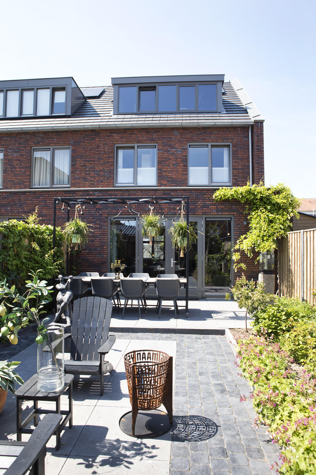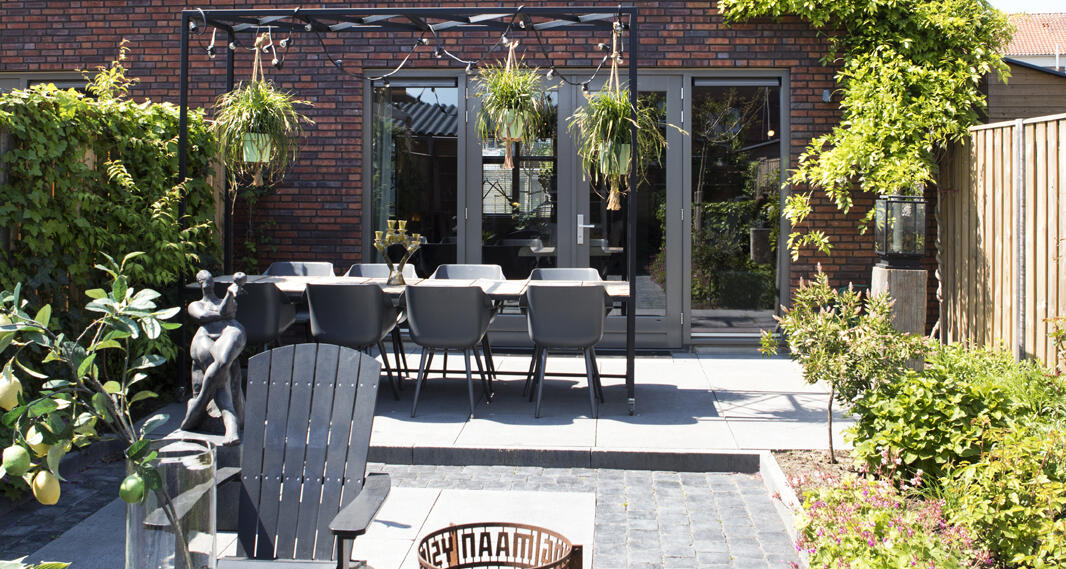 De zithoek aan de voorzijde van de woning wordt gedomineerd door de met velours beklede loungebank met daarachter een schitterende, enorm grote spiegel. “Die hebben we vanuit Iran naar Nederland laten vervoeren”, vertelt Cocky. Her en der vragen meer kunstvoorwerpen de aandacht. Dat samen eten belangrijk is, blijkt ook uit de grote eettafel op wielen achter de woning. Het open plafond boven de eettafel op het terras biedt mogelijkheden voor het aanbrengen van verlichting en planten.