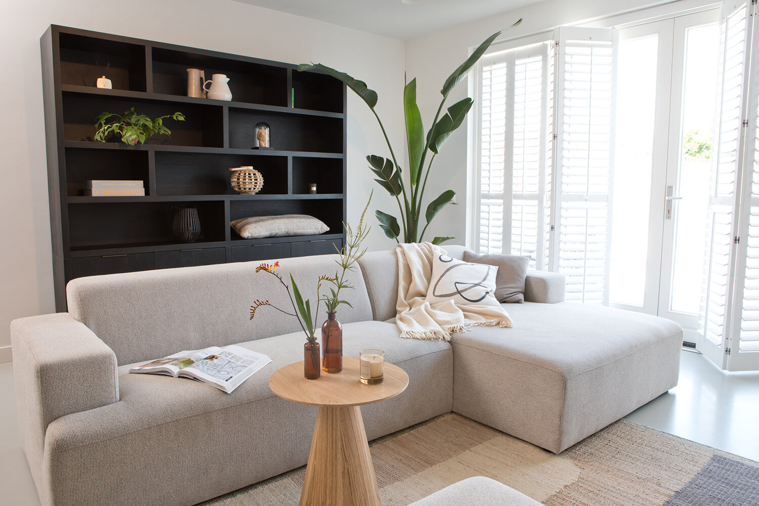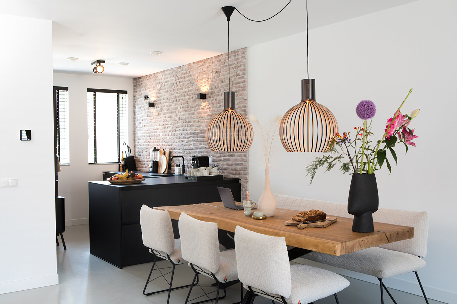 Emily is hoofdzakelijk verantwoordelijk voor de afwerking en inrichting van het huis. Ze wilde dat het enerzijds ‘clean’ zou ogen, maar anderzijds ook een warme, Scandinavische sfeer zou uitademen. “Je zou het ook landelijk kunnen noemen. De steenstrips bij de keuken in hoekopstelling dragen zeker aan die sfeer bij. De zwarte kleur van de keuken zorgt voor contrast.” Puru en Emily wilden de keuken graag aan de voorkant van de woning hebben, zodat de zithoek met openslaande deuren optimaal aansluit op de tuin. De eethoek - robuust houten blad en beige stoelen met zwart onderstel - vormt de natuurlijke verbinding tussen keuken- en zitgedeelte. De Secto designlamp is hier een ware eyecatcher.