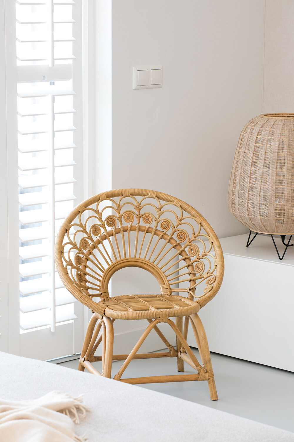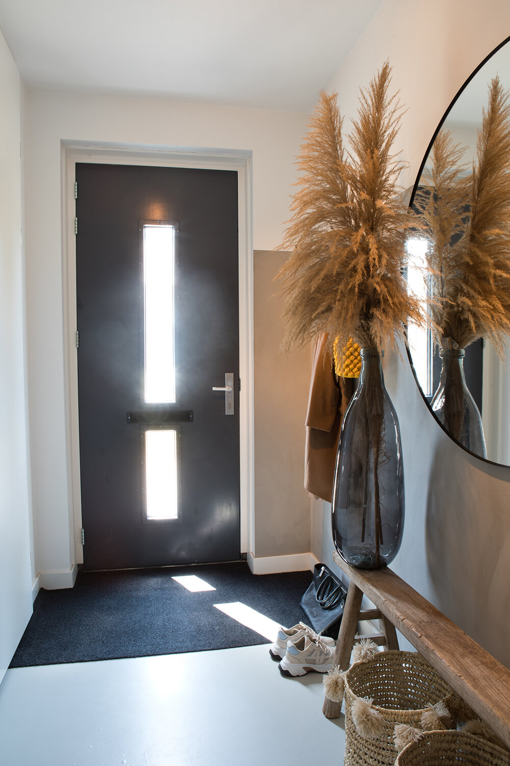 In de zithoek zorgt het donkere wandmeubel eveneens voor contrast, terwijl verder vooral lichte en natuurlijke kleuren het beeld bepalen. De gerieflijke bank met hocker nodigt uit tot lui achteroverleunen en televisie kijken. De prachtige rotanstoel kocht Emily nadat ze die bij een klant had gezien. Aan lichtinval geen gebrek, de witte shutters kunnen het daglicht zo nodig beperken of buitensluiten. De hele begane grond heeft een mooie strakke beige gietvloer; op de wanden is stucwerk en renovlies behang in rustige tinten aangebracht.