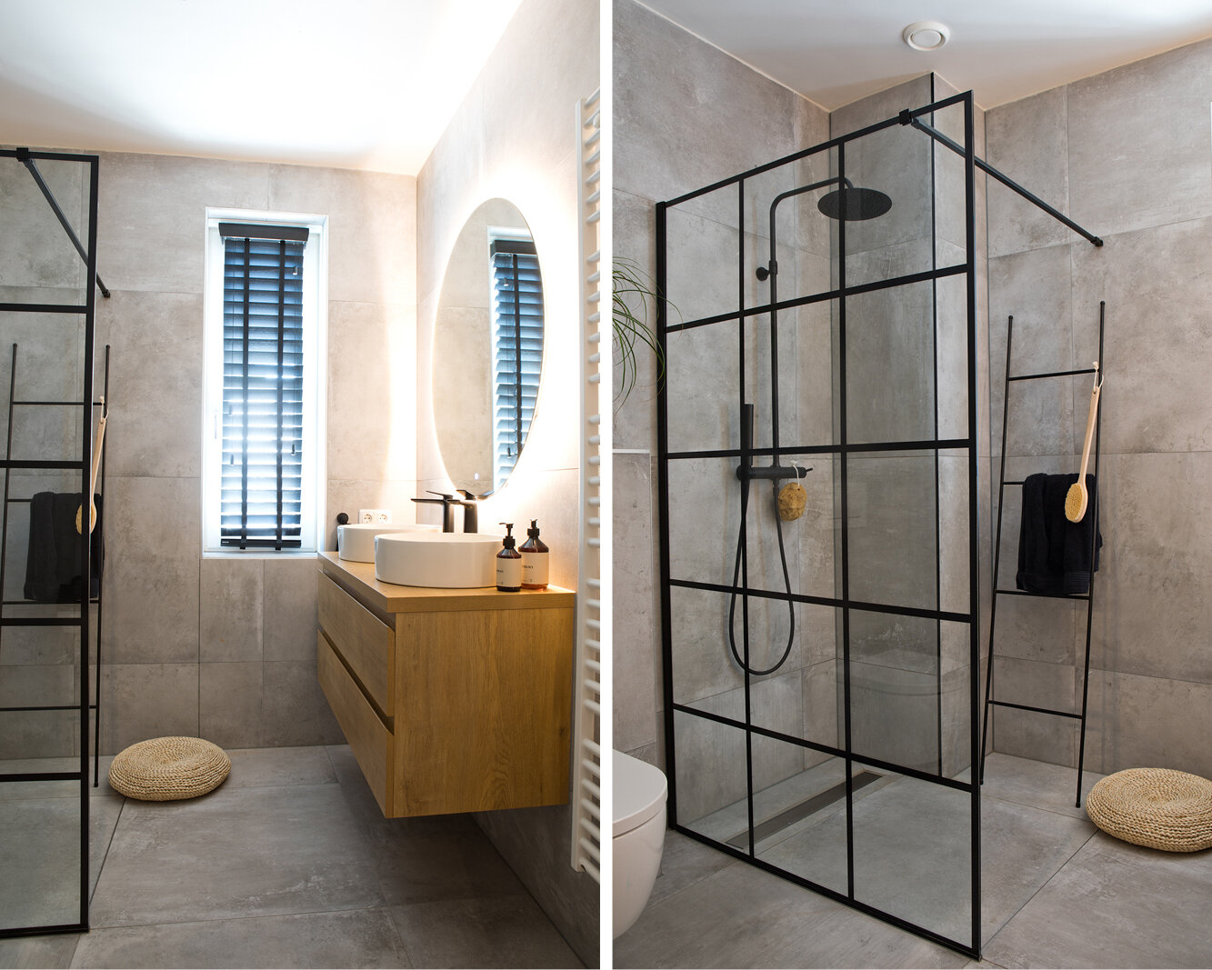 De tegels voor de badkamer zijn uitgekozen in Whoon Warenhuys en voor de inloopdouche hadden Emily en Puru voorkeur voor een industrieel ogende douchewand. De master bedroom is nog een ‘project voor de toekomst’, zegt Emily. Nu volstaan ze hier voorlopig met een box-spring en gordijnen in dezelfde kleur. Ook voor de zolder zijn er toekomstplannen (een dakkapel).