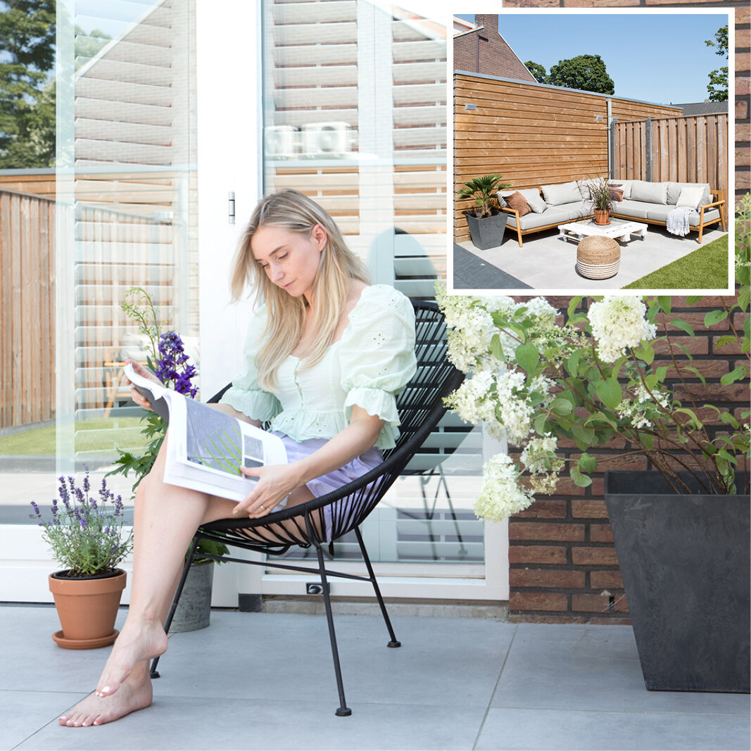 Maar voorlopig richten Emily en Puru zich op het volop genieten van hun woning en hun zoontje. In de tuin ligt daarom praktisch kunstgras en aan de achterzijde is een heerlijke lounge-set beschikbaar. Emily: “Nog een overkapping en wat vaste planten erbij en dan is het voor ons helemaal prima. We hebben het hier heel erg naar ons zin.”